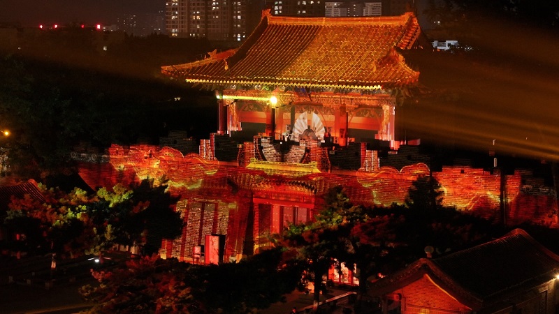 每日14時(shí)30分,活動(dòng)特邀來(lái)自肥城夢(mèng)幻桃花源的專業(yè)演職團(tuán)隊(duì)帶來(lái)專場(chǎng)文藝演出。當(dāng)夜幕降臨,18時(shí)30至21時(shí)(每半小時(shí)一場(chǎng)),岱廟北城墻將變身“巨型光影幕布”,上演燈光秀表演。光影流轉(zhuǎn)間,千年歷史與現(xiàn)代科技碰撞融合,讓游客在光影變幻中直觀感受泰山文化的厚重底蘊(yùn)與魅力。